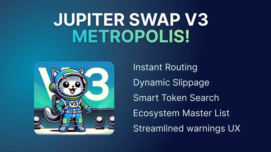 Jupiter launched Swap V3 with many new features, powered by its Metropolis liquidity backend. V3 features include instant routing, dynamic slippage, intelligent token filtering, and ecosystem token lists.