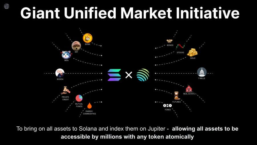 Jupiter kicks off the Giant Unified Market initiative to bring more assets, including memecoins, RWAs, stocks, or forex to Solana and index them on Jupiter. Jupiter has launched the GUM Alliance and will focus on asset onboarding and market integrations in the next few months.