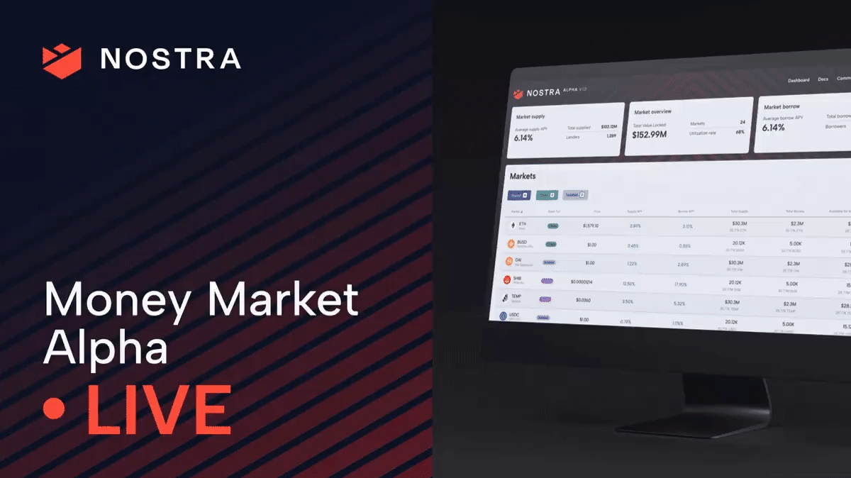 Lending protocol Nostra launches alpha (with deposit limit) on StarkNet mainnet, enabling money markets with low tx costs on StarkNet.
