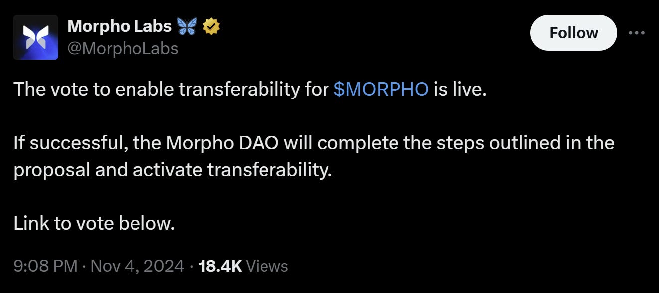 Morpho Labs has initiated a vote to allow transferability for $MORPHO. If approved, the Morpho DAO will implement the steps outlined in the proposal to activate token transferability. Link to vote here.