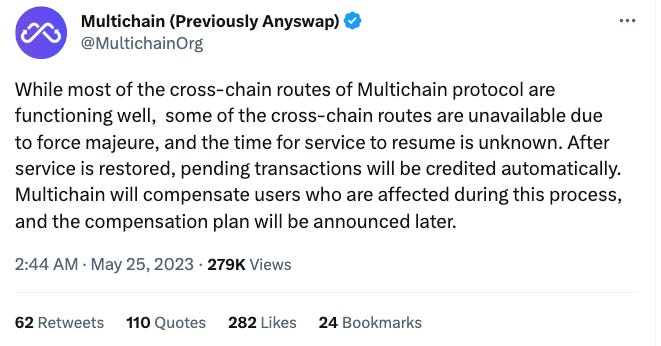 Some bridging routes (Kava、zkSync、Polygon zkEVM) on Multichain are paused and some traders’ funds are stuck on the bridges. There are also unconfirmed rumors of the cofounder's arrest in China and an investor sell-off of its token.