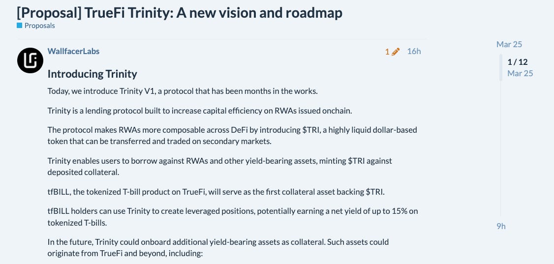 TrueFi plans to launch Trinity, an RWA lending platform allowing users to borrow against RWAs and other yield-bearing assets, minting $TRI against deposited collateral.