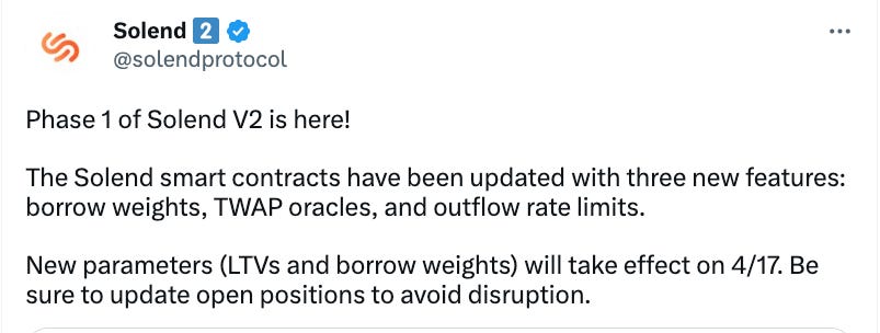 Solend V2 phase 1 is now live with borrow weights, TWAP oracles, and outflow rate limits enabled on Solend contracts.