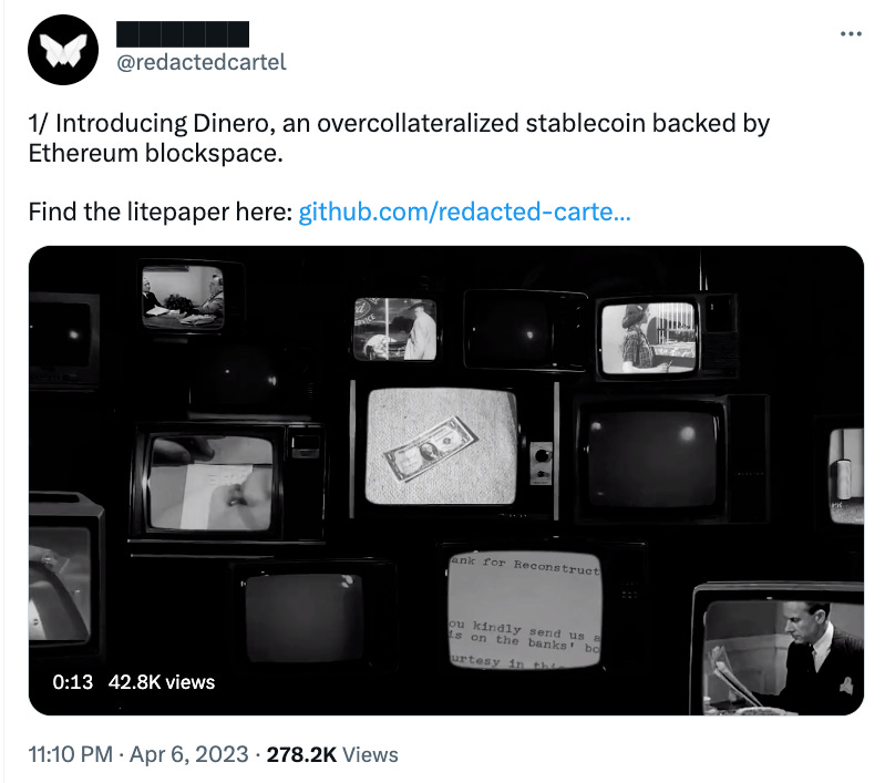 Redacted Cartel passed the vote to launch Dinero Protocol. Dinero will have a permissionless RPC, an overcollateralized stablecoin $DINERO, and an ETH liquid staking token $LST.