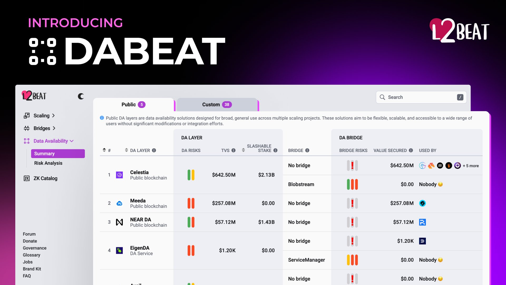 L2BEAT has launched DABEAT, a platform for exploring and assessing Data Availability (DA) layers for L2 transaction data security. Users can view detailed DA metrics, switch between bridges, and access comprehensive risk analyses, including DAC member listings and architecture details. The new Risk Grissini model provides additional risk evaluations for DA and Bridge projects.