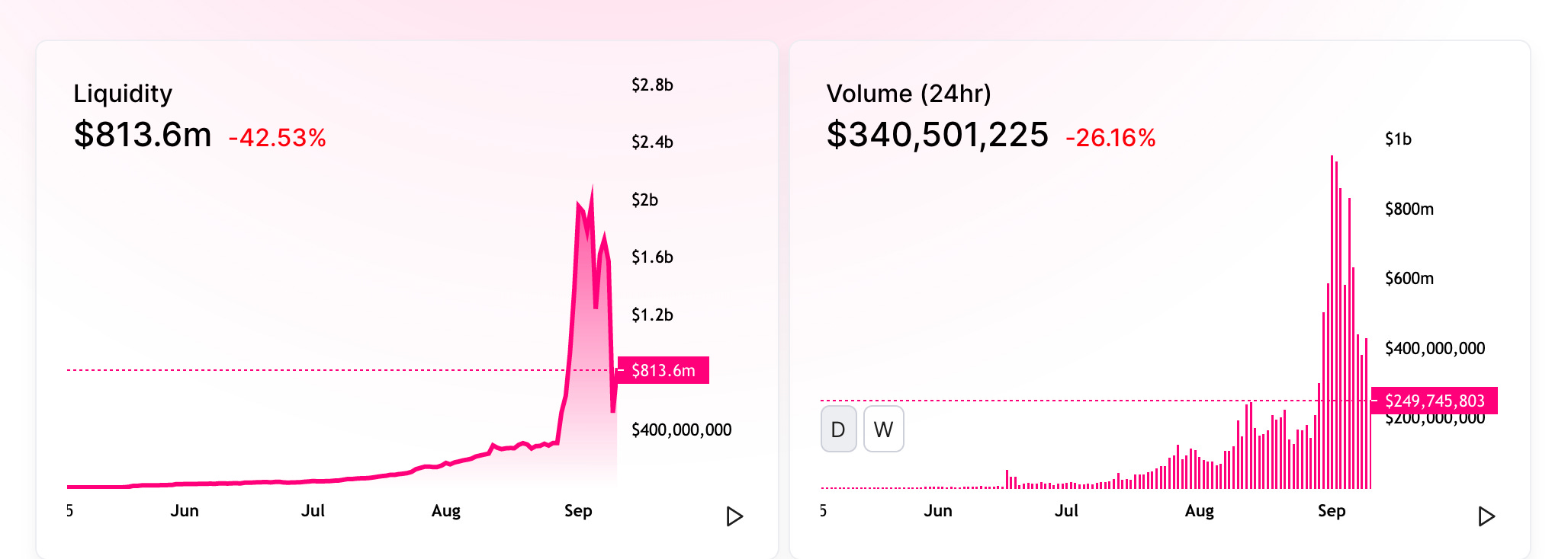 Right after the migration, Sushiswap’s liquidity was around 1.15B, significantly more than Uniswap’s 518M at the time. However, at press time, Uniswap’s volume has increased significantly. It seems that current farms are still prefering Uniswap’s LP tokens. This may be because Uniswap still has a much greater variety of tokens than Sushiswap, which at migration time had a limited set of pools.