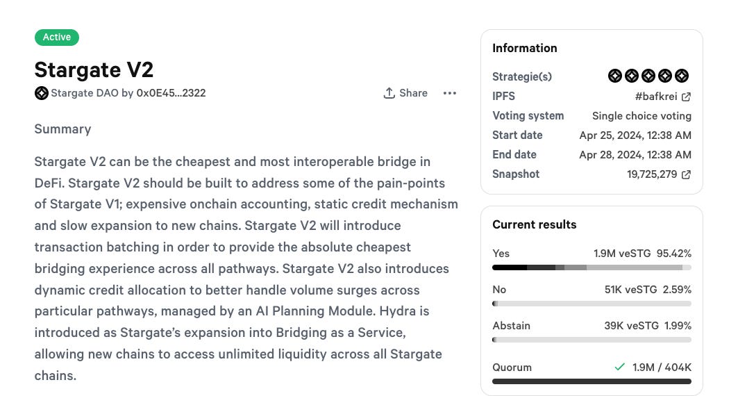 Stargate DAO proposed V2. V2 will introduce transaction batching and dynamic credit allocation (managed by the AI ββPlanning Module), aiming to improve cross-chain efficiency and reduce cross-chain costs. The vote will end on April 28.