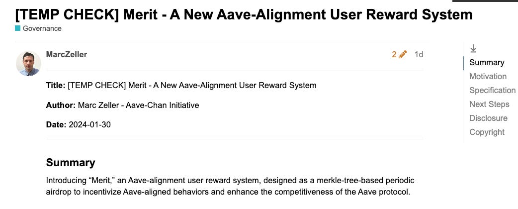 Aave ACI proposes to introduce Merit, an Aave-alignment user reward system. Merit will serve as a multiplier-based reward system to reward certain actions with points, representing weekly distributions of stkAAVE and GHO rewards.