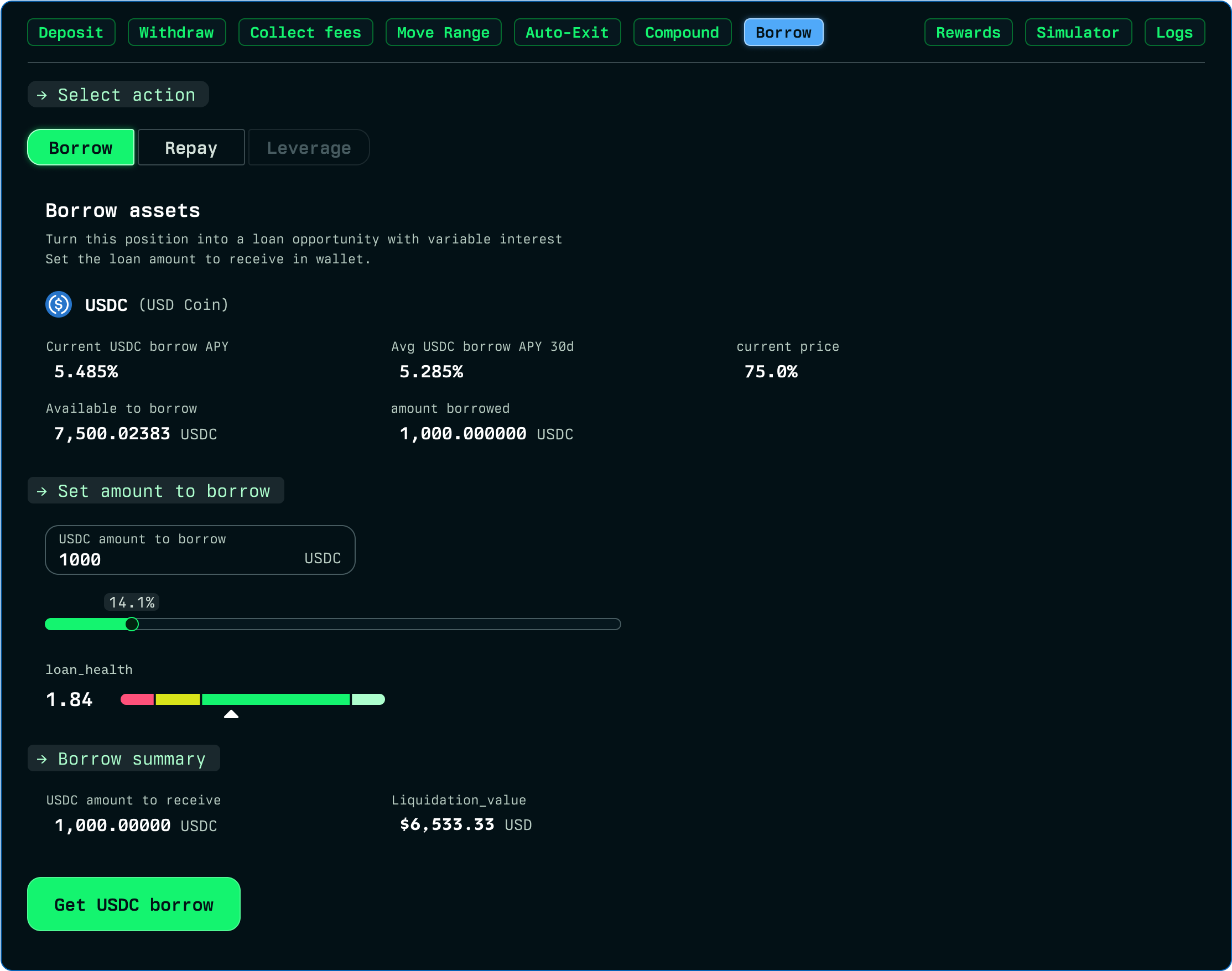 Even with collateralized positions, users can continue to manage and optimize their liquidity just as they would normally. Integrated seamlessly into Revert’s position management interface, Revert also supports automation tools like Auto-Range, Auto-Compound, and Auto-Exit, ensuring that collateralized positions perform just as efficiently as standard LP positions.
