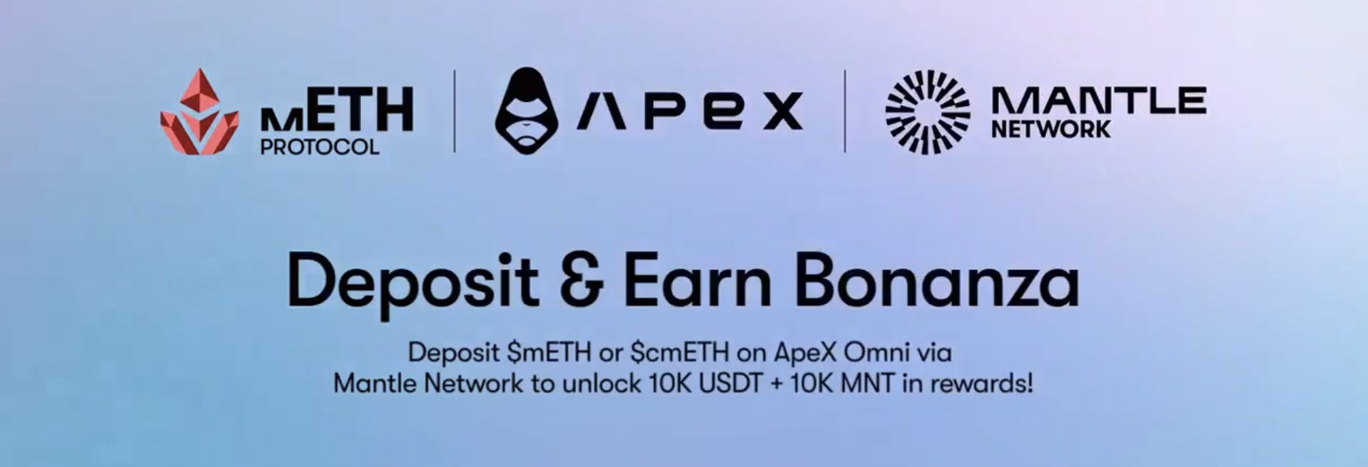 mETH Protocol has launched a deposit campaign on ApeX Omni via Mantle Network, running from Feb. 11 to Feb. 25, offering a 10K USDT + 10K MNT reward pool. Users who deposit mETH or cmETH as collateral can earn up to 500 USDT in rewards, on top of staking yields, Powder, and restaking rewards. Deposits must exceed 100 USDT (net of withdrawals) to qualify.