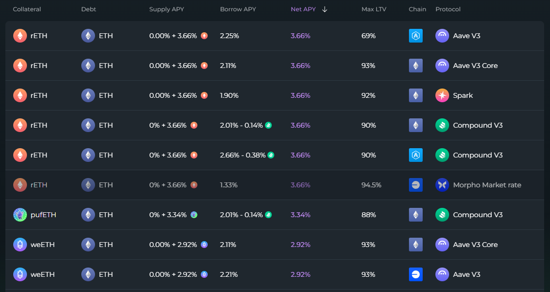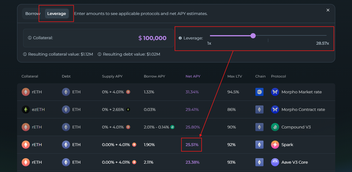 Note: the Net APY view reflects supply vs borrow rates - it doesn’t automatically account for leverage.